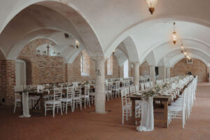 Architektur und Details spielen eine zentrale Rolle: lange Tafeln unter Gewölben, natürliche Materialien, florale Zurückhaltung. Räume und Linien werden bewusst in die Bildkomposition eingebunden und verleihen der Reportage Ruhe und Struktur. Schwarz-weiße Aufnahmen verstärken den zeitlosen Charakter und lenken den Blick auf Gesten, Bewegung und Gefühl.