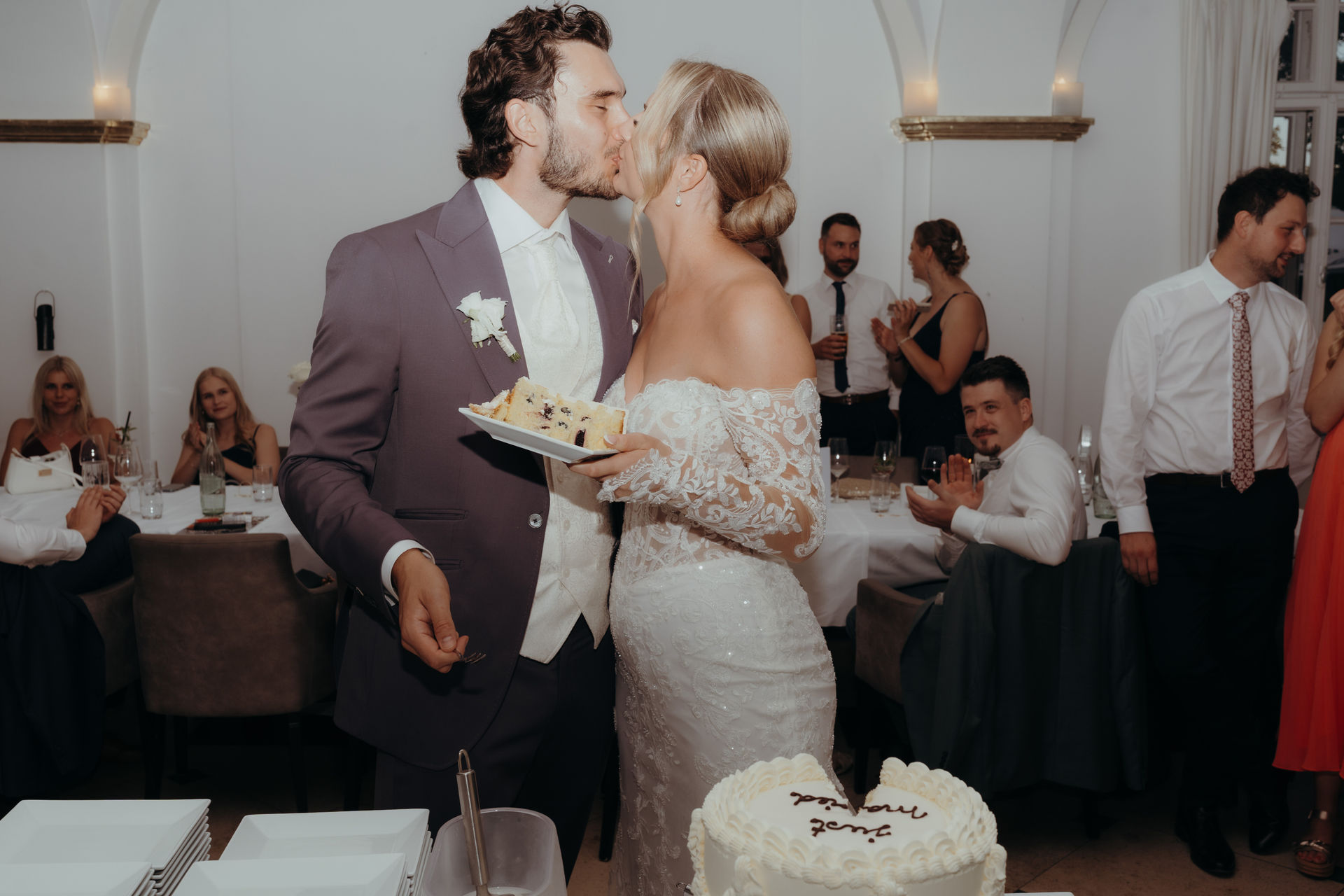 Während der Feier entstehen unaufdringliche Reportageaufnahmen: das Anschneiden der Torte, gemeinsames Lachen, Umarmungen und flüchtige Augenblicke zwischen Brautpaar und Gästen. Authentisch festgehalten, ohne den Moment zu stören.